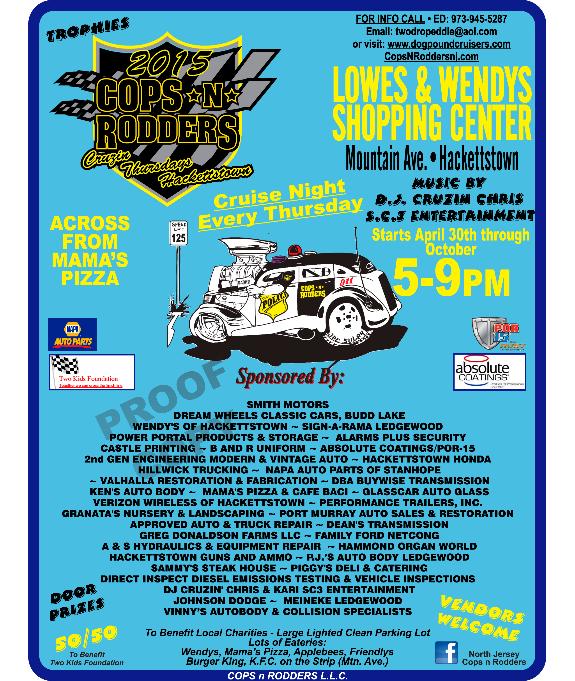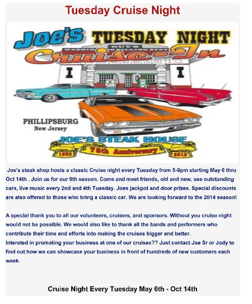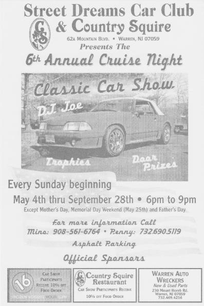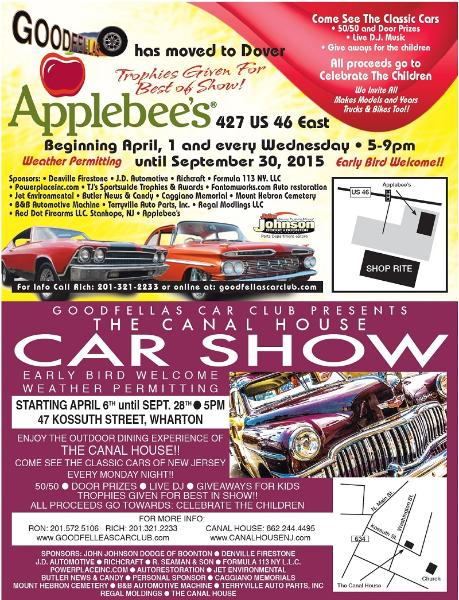 | Mon Canal House, Wharton May 4th Tue Sunset Cruz in Ledgewood TBA Tue Budd Lake A&P May 1st Wed GoodFellas Applebee's Dover Apr 1 Thu CopsNRodders Hackettstown Apr 30th Fri Starlight Cruisers Boonton May 1st Sat The Chatterbox in Augusta May 2nd Sun |